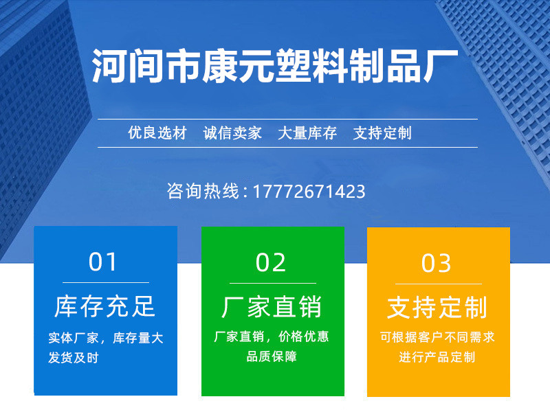 河间市康元塑料制品厂,实力雄厚,重信用,守合同,保证质量,供货及时,以多种经营特色与薄利多销为原则,以质量至上,用户至上为经营理念,欢迎各业界朋友莅临参观、指导和业务洽谈。