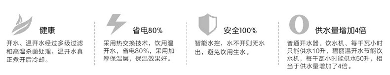 产品特点:1、特设高效热能交换器,省电80%。2、开水,温开水,经过多级净化过滤,四级过滤(PP+烧结活性炭+KDF+双高效活性炭)过滤和高温杀菌处理。五级过滤(PP+烧结活性炭+KDF+双高效活性炭+RO反渗透过滤膜或高精超滤过滤)。3、具有智能水控系统,水不开,则无水流出,避免饮用生水。4、常压式技术设计,更安全。5、全不锈钢制造,水槽模压成型,人机工程设计。注:适用水压0.05-0.6MPa,适用水源,城市自来水。