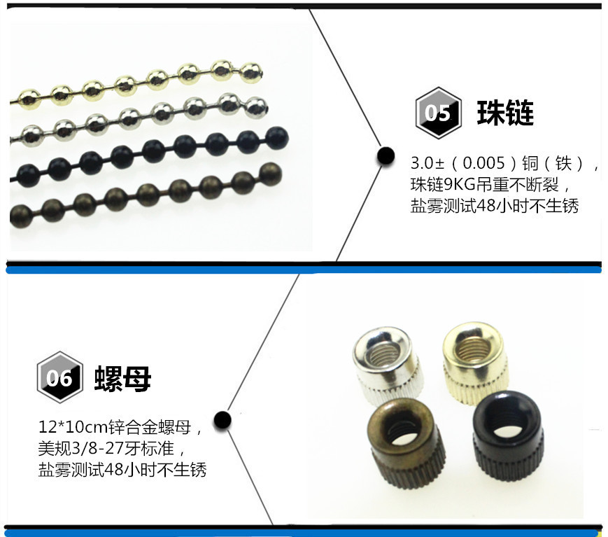 [产品说明]:产品珠链颜色为金色/镍色常规外露5cm,其他珠链与电线长度可根据客户要求订做