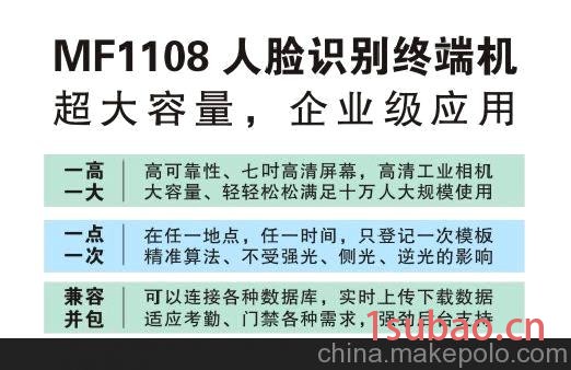 摩尔MF1108人脸识别考勤机 通过摄像设备实时捕捉人脸图像,并即时根据预存在数据库中的人脸特征进行比对,快速确定被识别者的身份。相对于智能卡或其它的生物识别技术,MoreFace人脸识别设备在安全性、可靠性、容量、速度、成本等方面具有明显的综合优势: