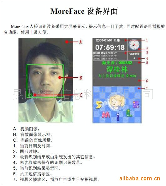 摩尔MF1108人脸识别考勤机 通过摄像设备实时捕捉人脸图像,并即时根据预存在数据库中的人脸特征进行比对,快速确定被识别者的身份。相对于智能卡或其它的生物识别技术,MoreFace人脸识别设备在安全性、可靠性、容量、速度、成本等方面具有明显的综合优势: