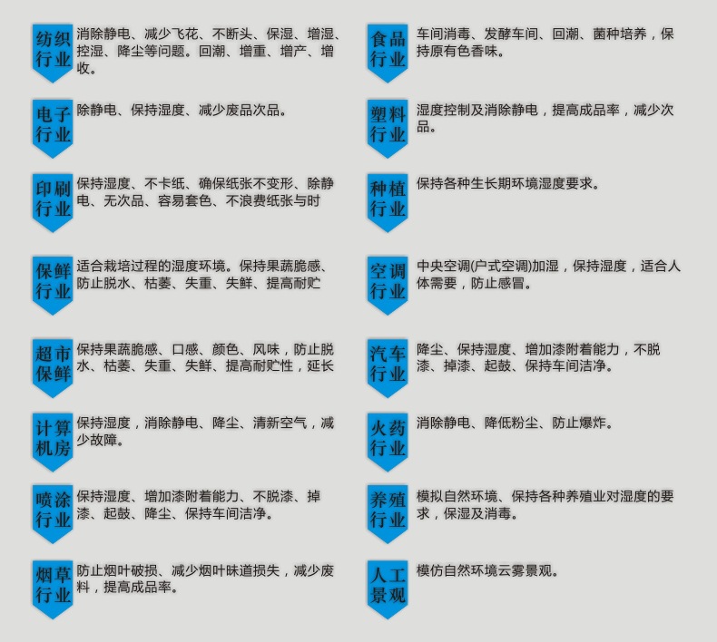 超声波加湿器是广泛应用于工厂车间、商业设施、纺织行业、印刷行业、烟厂、喷涂、食用菌、种植花卉、实验室等等,需要特定湿度环境的新一代超声波加湿设备。适合的相对湿度对提高产品质量、降低废品率、防静电、消除粉尘、净化空气和改善环境均具有决定性的作用。