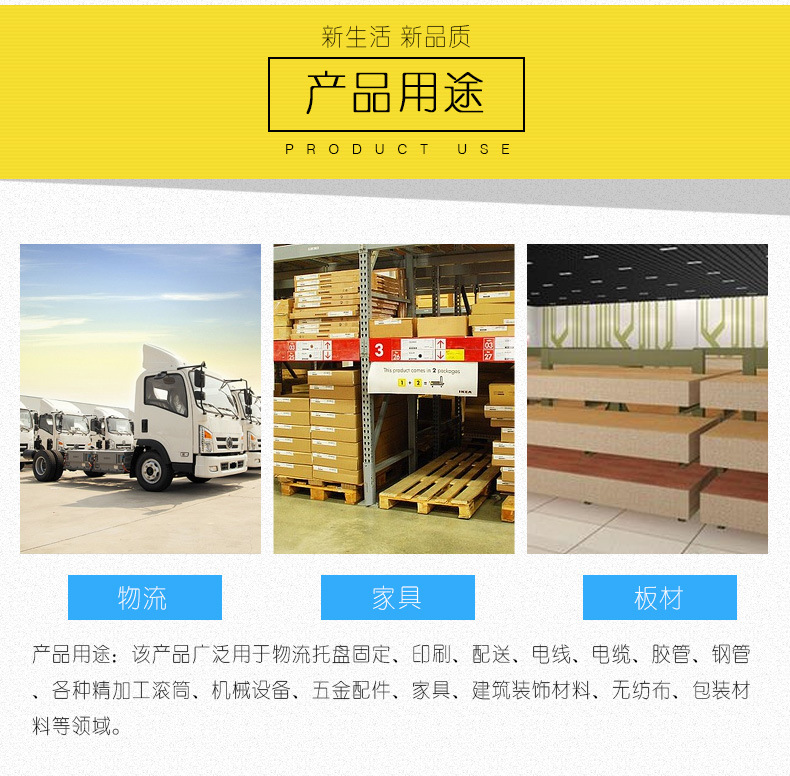| 用途 | 该产品广泛用于物流托盘固定、印刷、配送、电线、电缆、胶管、钢管、各种精加工滚筒、机械设备、五金配件、 |
