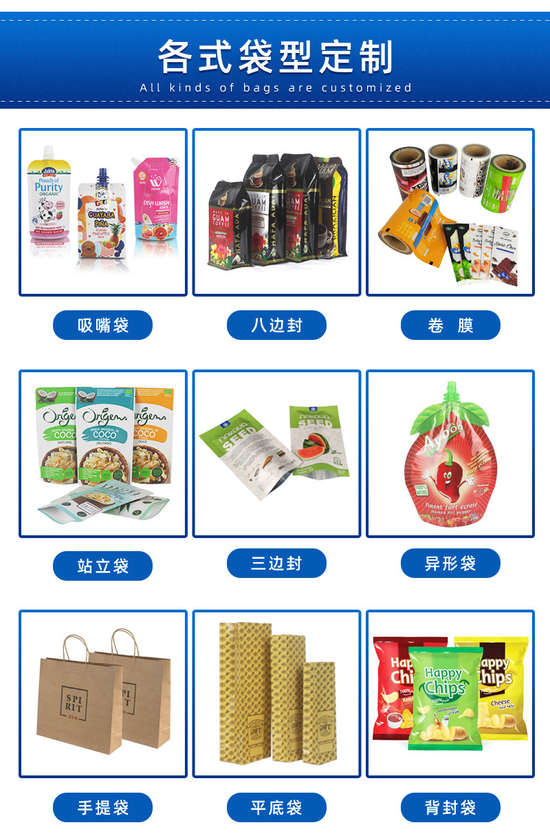 主营:宠物犬粮包装袋,手提扣大米包装袋,八边封包装袋,宠物食品袋,大米包装袋,抽真空米砖袋,自立拉链袋,自立吸嘴袋,复合包装卷膜,异…