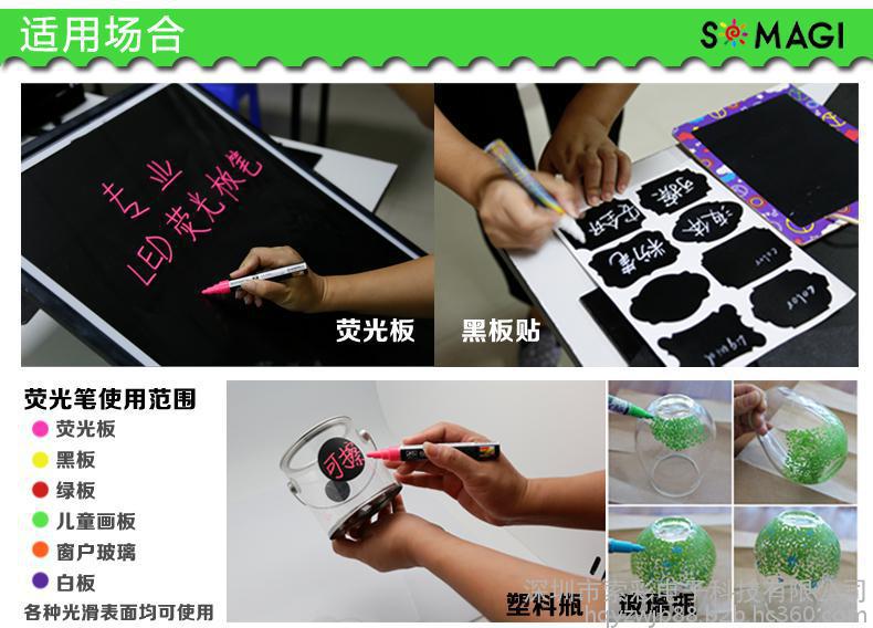 1. 产品特点:采用进口高亮度荧光墨水,常规有8个颜色,无毒无味、亮度高、易擦拭。让你的POP文字、图片等广告内容颜色异常鲜艳绚丽!因其安全性,色泽鲜艳等特点,可用于玻璃、窗户、塑料、荧光板、黑板以及平整光滑的表面。
