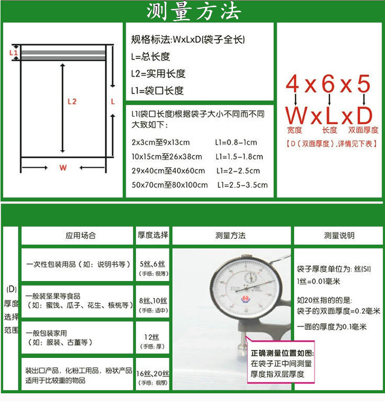 双层6丝厚袋子,实际厚度在5.2丝左右; 双层7丝厚袋子,实际厚度在6.2丝左右;