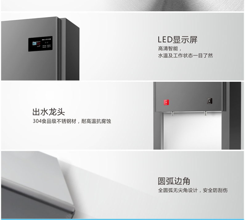 4、工作效率免去了不断更换桶装水的麻烦;无需专人去搬运、监管桶装水;水龙头较多、供水量大,减少等待时间;温开水(水烧开后降温)可直接饮用,比喝开水省时间。(5)美观全不锈钢制造,水槽模压成型,人机工程设计。
