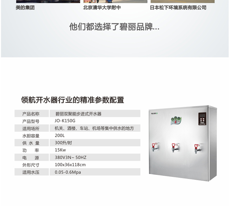 上海碧丽饮水设备有限公司创立于2012年,是一家专注于净化过滤一体商用开水器,节能饮水机,开水器,工业纯水机组,空气能热泵,智能家电,电热水器,燃气热水器等设备研发和制造的厂家。在产品应用上实现即热技术与反渗透净水技术结合,并在国内率先成功开发的即热式加热技术更是使中国开水器从传统浮球式的“阴阳水”、“混合水”、“千沸水”的技术时代一步跨入了即开即饮节能直饮水时代,与国际水平同步接轨,成为革命性的技术创新。