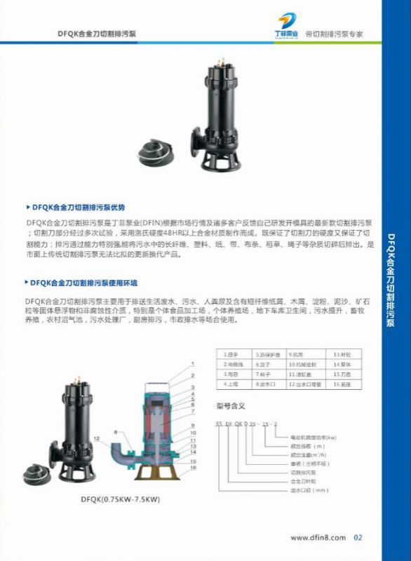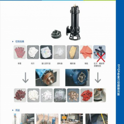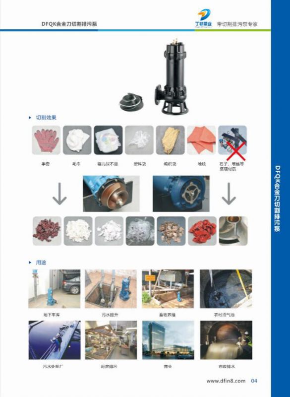 DFQK切割塑料袋带切割排污泵主要用于排送生活废水、污水、人粪尿及含有短纤维纸屑、木屑、淀粉、泥沙、矿石粒等固体悬浮物和非腐蚀性介质,特别是个体食品加工场,个体齐殖场,地下车库卫生间,污水提升,畜牧养殖,农村沼气池,污水处理厂,厨房排污,市政排水等场合使用。