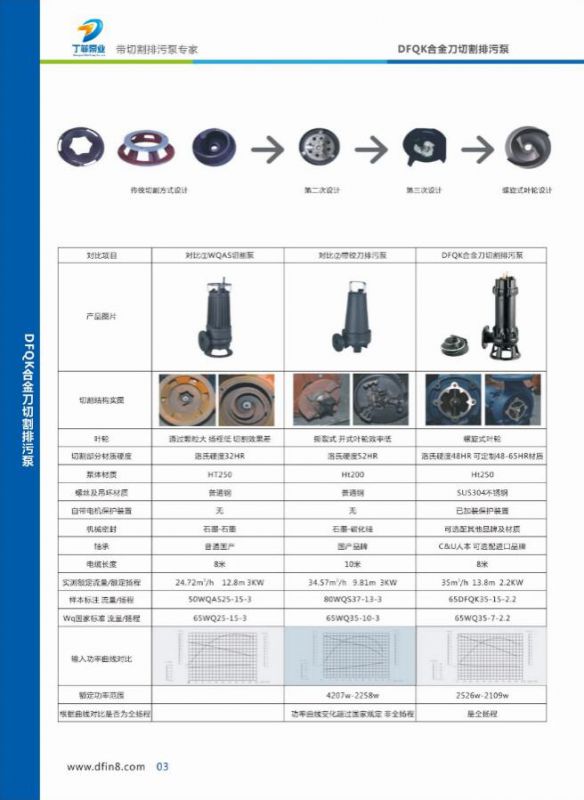 DFQK切割塑料袋带切割排污泵是丁菲泵业(DFIN)根据市场行情及诸多客户反馈自己研发开模具的款切割排污泵;切割刀部分经过多次试验,采用洛氏硬度48HR以上合金材质制作而成,既保证了切割刀的硬度又保证了切割能力;排污通过能力特别强,能将污水中的长纤维、塑料、纸、带、布条、稻草、绳子等杂质切碎后排出。是市面上传统切割排污泵无法比拟的更新换代产品。