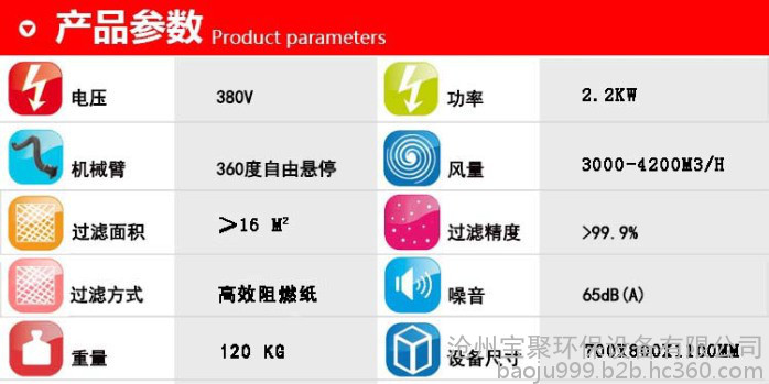 移动式焊烟净化器采用具有耐化学腐蚀性和耐热性的活动臂管,外部软管为PVC和玻璃纤维混合物,有较强的柔韧性和耐磨性,不易折断和磨损。活动臂管内有铝合金材质构架,可自行支撑,使软管停止与三维空间的任意位置。吸风罩可以根据现场的工作需要进行配置,如加大型、圆形、附带工作灯型、方口型等。悬挂式焊烟净化器固定于墙上或房顶,不占空间,在需要的时候只需将活动臂管拉到一定的位置即可随时进行净化。