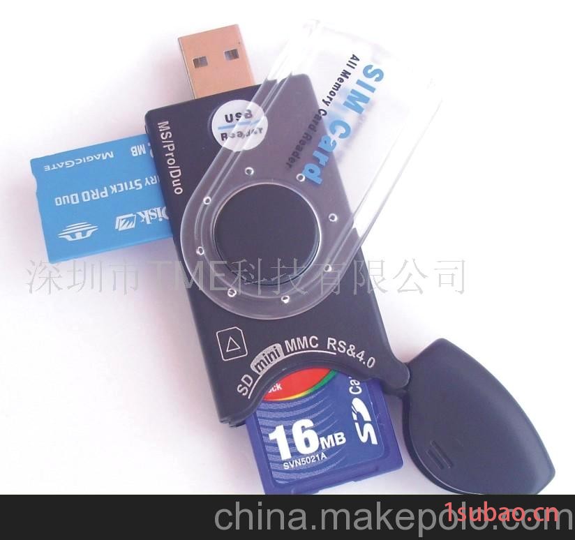 産品特點:1、可反復讀和擦寫多種卡:SD/mini SD Card、micro SD(T-Flash)、Secure Digital Card、Multimedia Card、Multimedia Card Plus(MMc)、RS-MMC(MMC Mobile)、MMC Card4.0、RS-MMC4.0(MMC Mobile4.0)MMC micro、MS/MS DUO/MS PRO DUO、SIM Card。以小型記憶卡爲媒介的産品有:個人電腦、 Notebook、PDA、數碼相機、2、手機、印相機、數字攝影機、MP3 Player;3、可與MP3、PDA、數碼相機、移動電話等産品與電腦交換數據資料;4、可直接於讀卡器上觀看及編輯圖片等檔