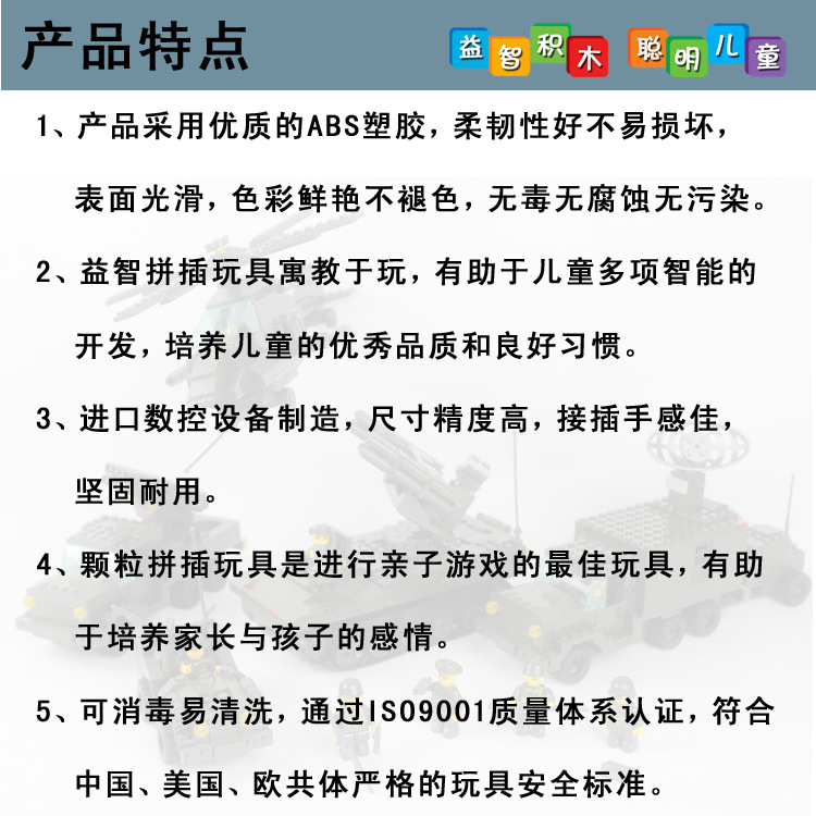 2、益智拼插玩具寓教于玩,有助于儿童多项智能的开发,培养儿童的优秀品质和良好习惯。