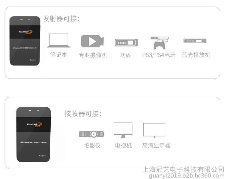 【冠艺GUANYEE】无线HDMI多发一收影音传输器:WIHD-551,30米传输免驱无线投屏,手机平板电脑无线同屏,1080P显示支持3D