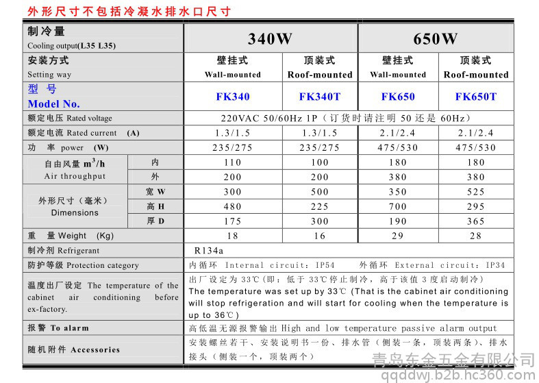 青岛电气柜大功率降温空调丰力特KF650 电气柜空调 山东电气柜空调
