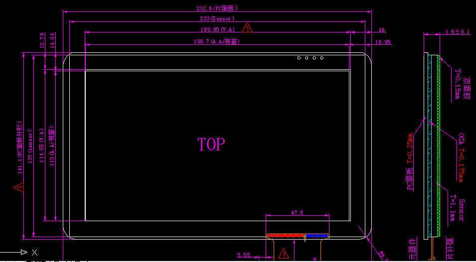 1、结构:PC面板(0.25mm)+普通单面消影SENSOR(1.1mm)+FPC(带IC)+底胶(T=0.15mm).