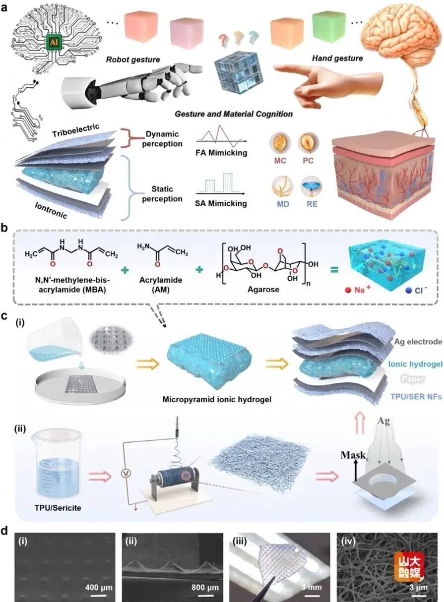 近日,山东大学集成电路学院李阳教授团队在国际期刊 Advanced Science发表题为“Bio-Inspired SA-FA Bionic Dual Receptor Electronic Skin for Intelligent Gesture and Material Cognition Systems Enhanced by Static-Dynamic Mutual Interaction” 的长篇研究性论文。该论文创新地提出了一种仿生SA-FA双受体(BDR)电子皮肤,通过静态-动态互作增强机制深度融合SA与FA的功能特征,在单一器件中实现了稳定压力检测与快速瞬态响应的统一,为电子皮肤跨入“认知级”发展奠定了基础。该电子皮肤由两部分构成:离子水凝胶微金字塔结构单元(仿SA受体),具备线性灵敏度高达172 kPa⁻¹(30 kPa范围)、响应/恢复时间仅11.2 ms、检测下限低至0.5 Pa;静电纺丝TPU/绢云母纤维摩擦电单元(仿FA受体),具有优异的自供能特性和材料识别能力。