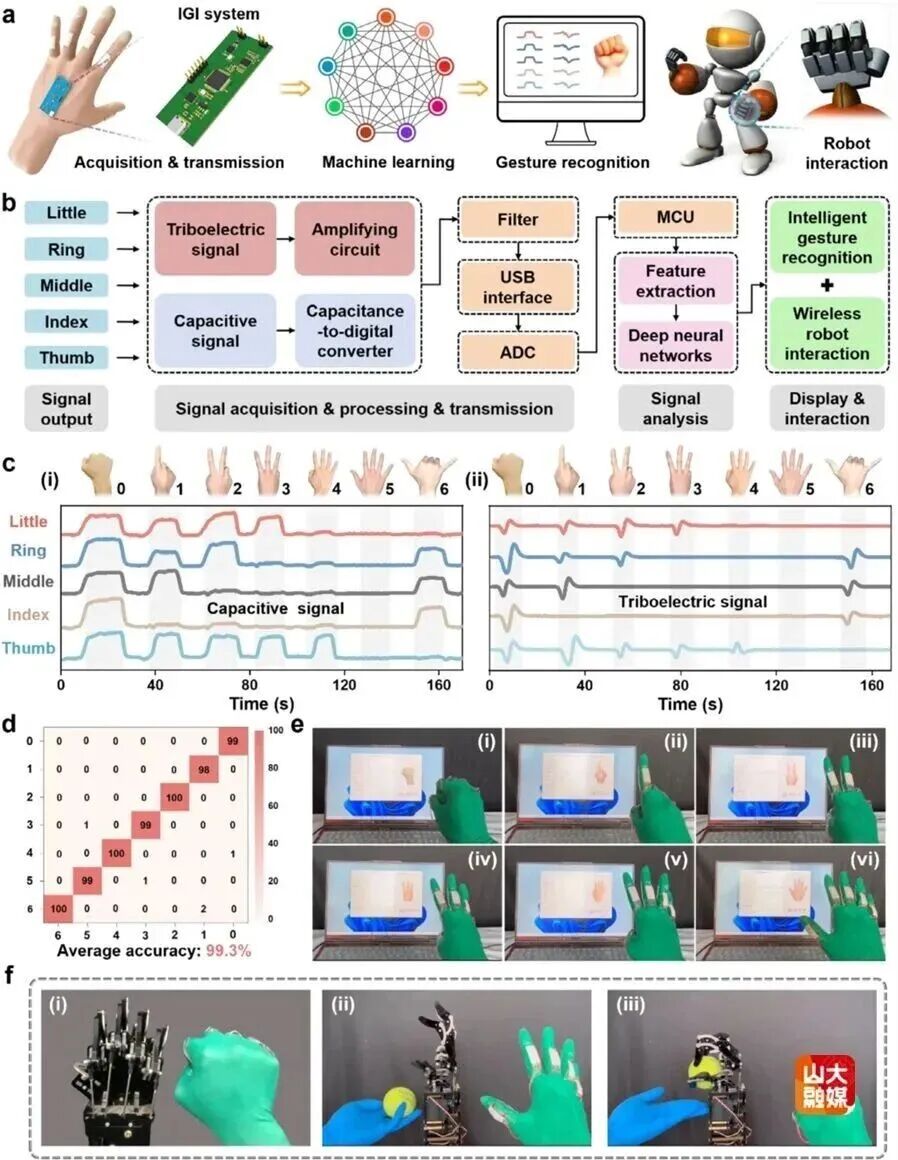 基于此创新,研究团队构建了两个系统验证其性能。智能手套认知系统:利用电容与电压双通道信号,结合深度神经网络(DNN),实现对7种手语动作的精准识别,平均准确率达99.3%,并可实时驱动机械手完成复杂交互。智能自主材料认知系统:将BDR电子皮肤集成至机器人手指,结合1D-CNN算法,仅需一次触摸即可识别材料的电负性、硬/软度及类别(Ecoflex、PVDF、HDPE、纸张、PET、PU),平均准确率达96.2%,并能在可视化界面实时显示。