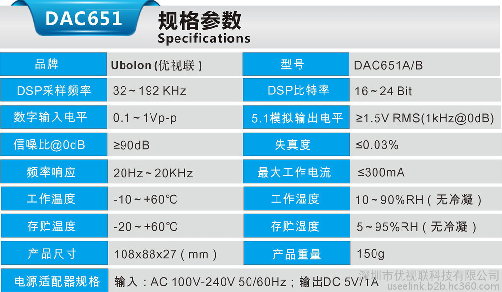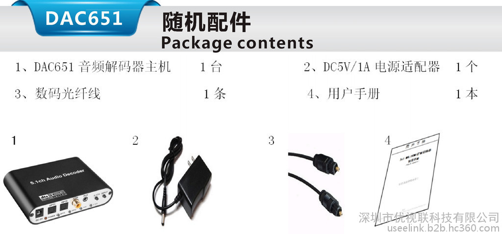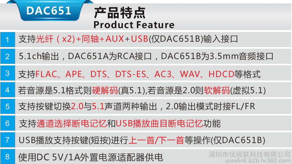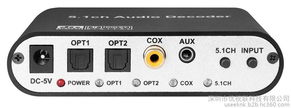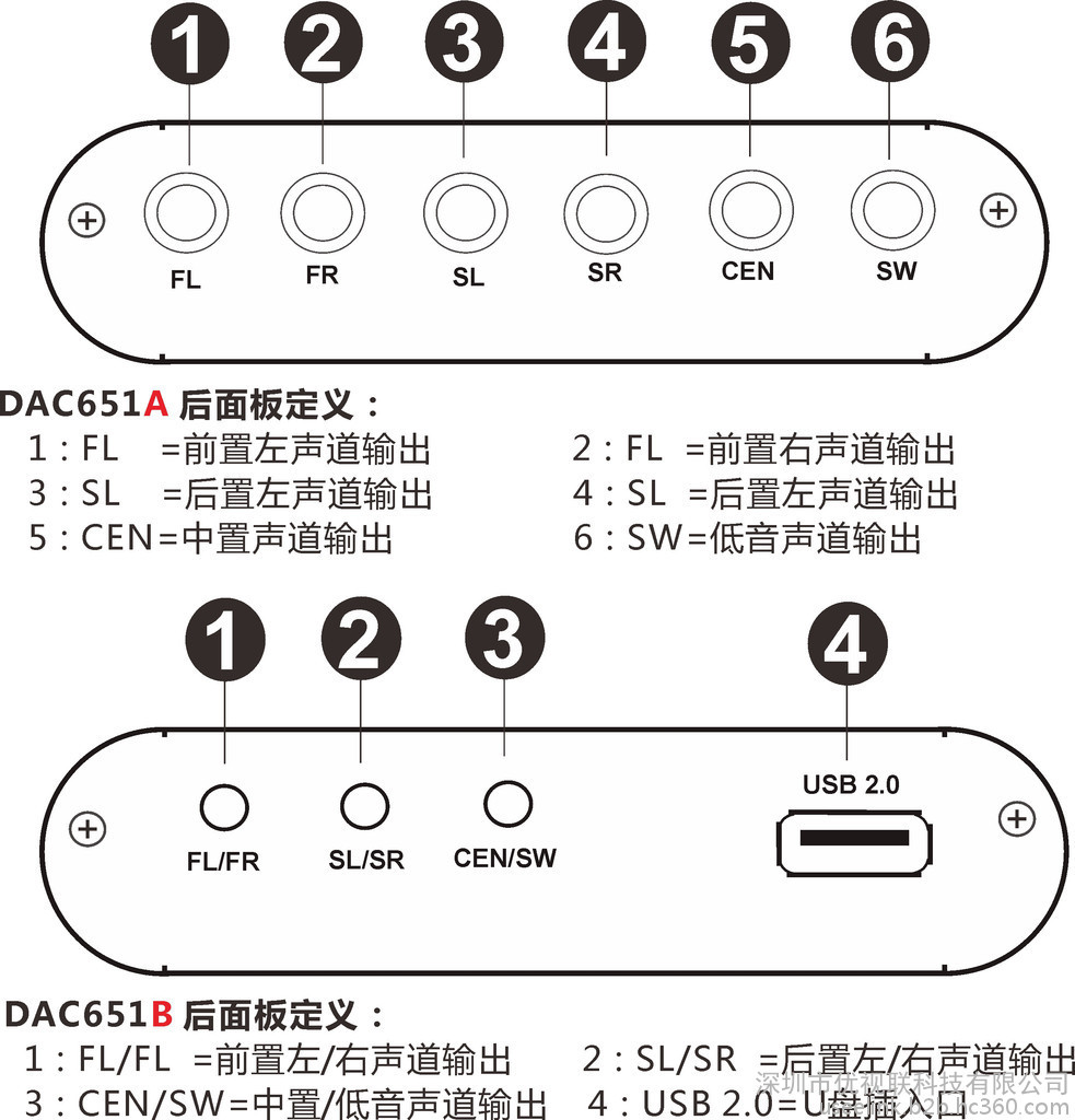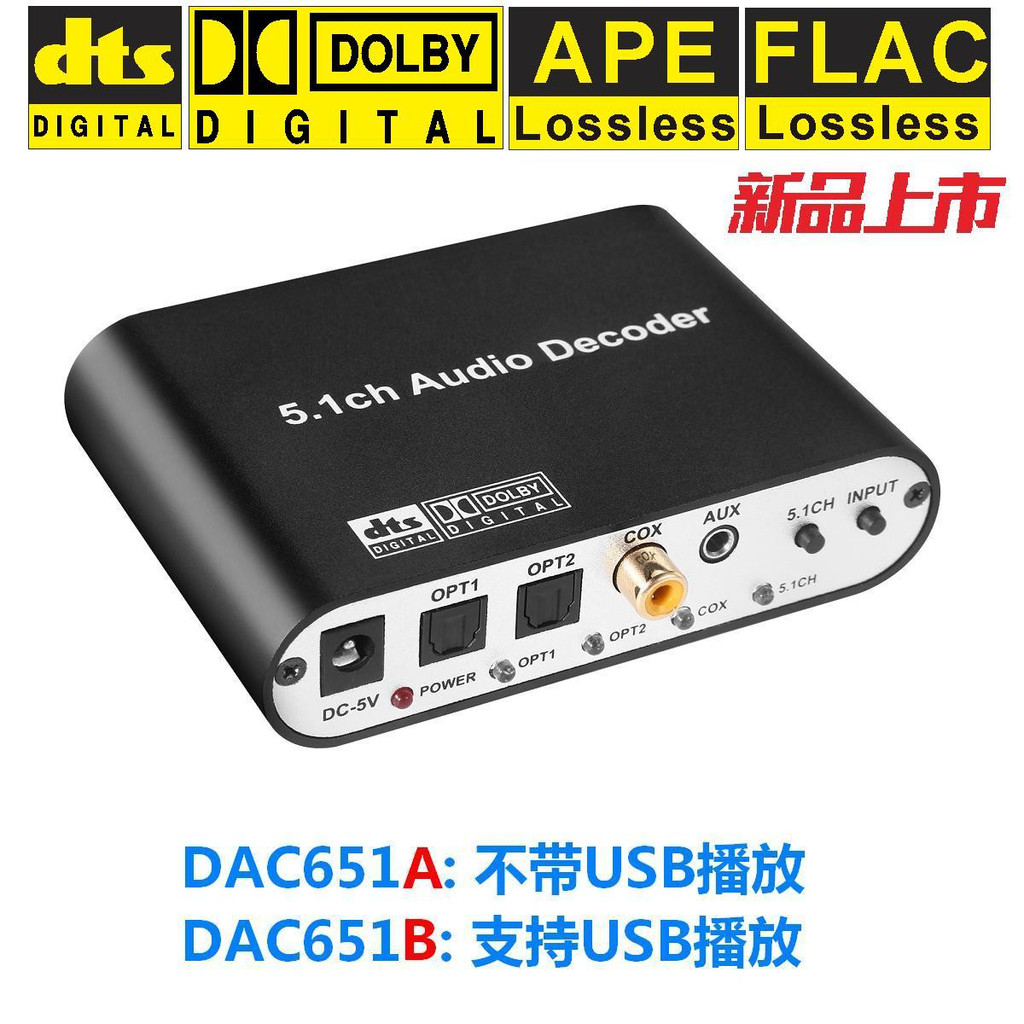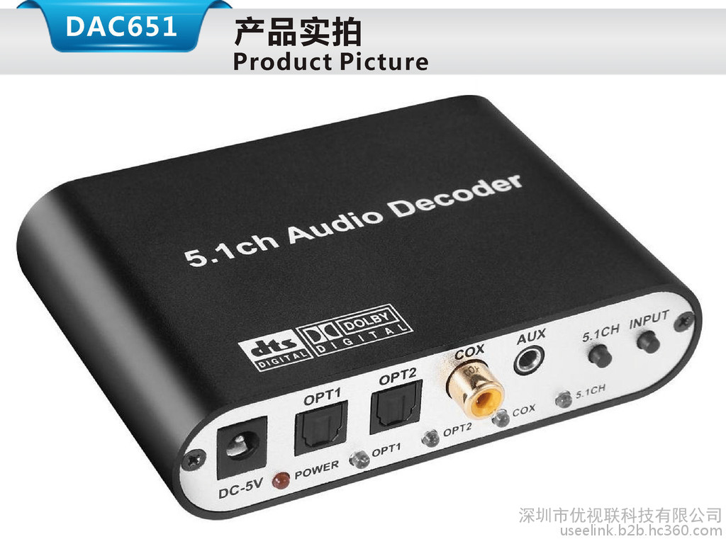 2、支持1组5.1ch输出,DAC651A为RCA接口,DAC651B为3.5mm音频接口