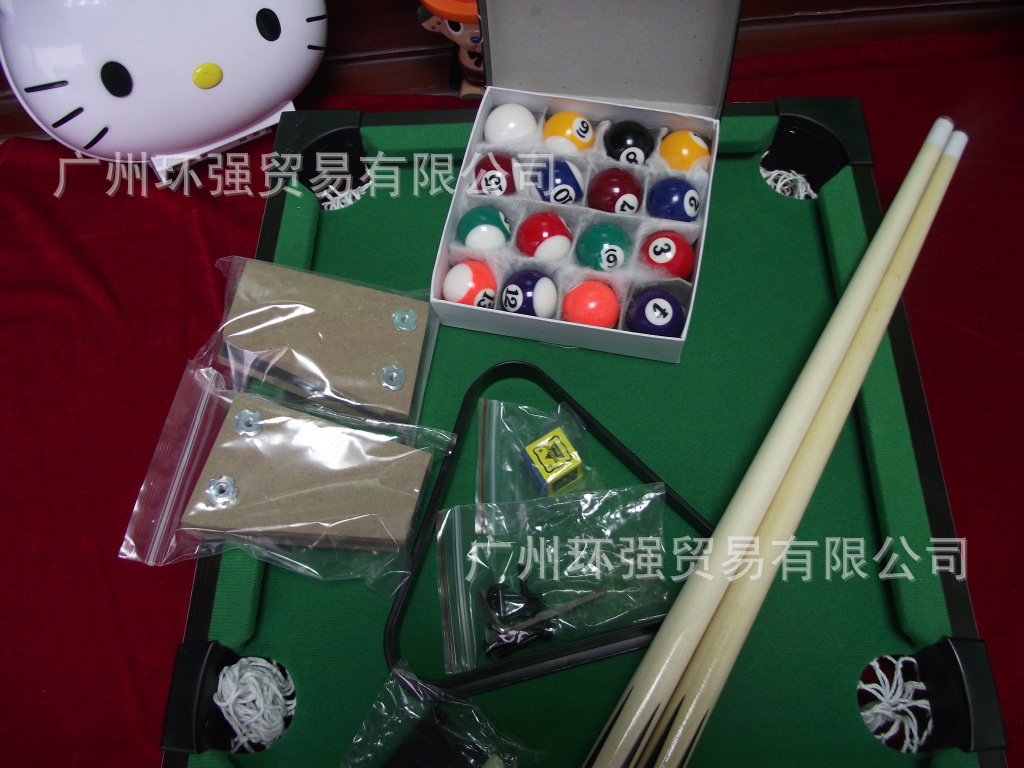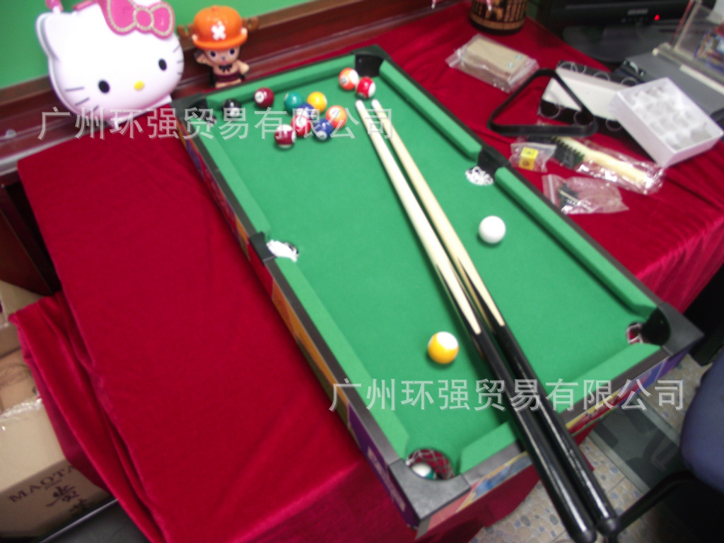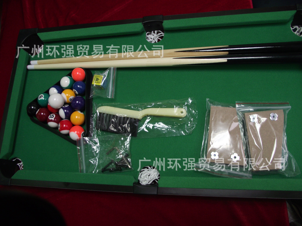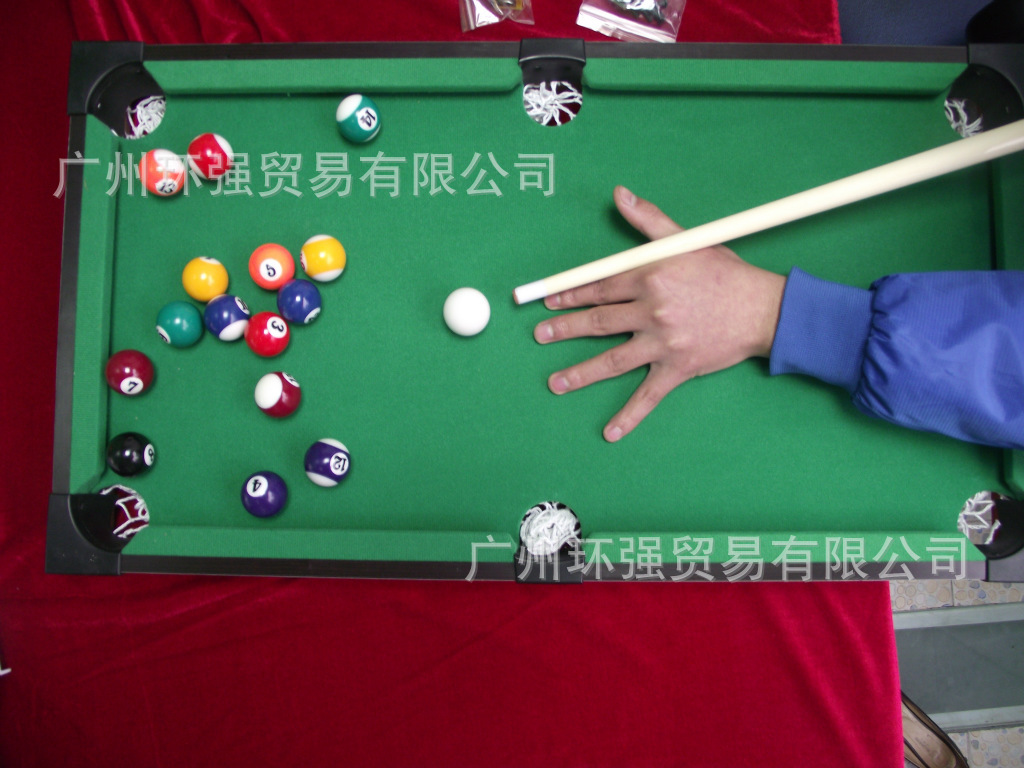 台球桌采用木质(压缩板/密度板)材料制作,做工精量,完全可与真正的台球桌媲美,球与球杆均采用与真正台球完全一样的材料,个头比真正的台球相仿。