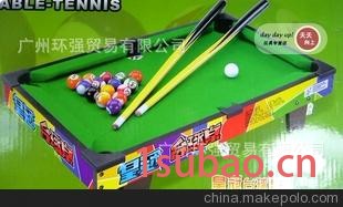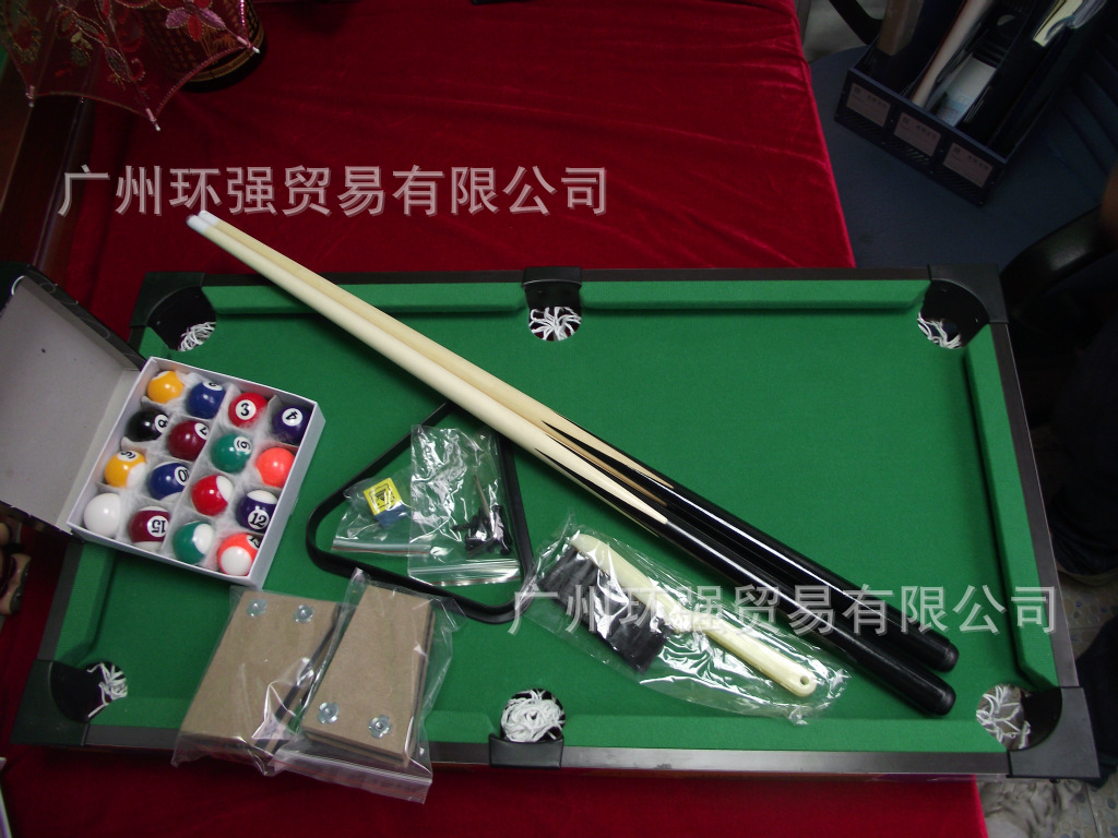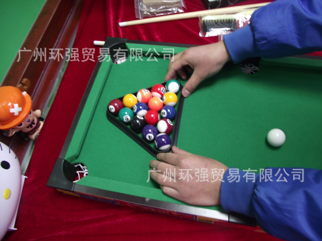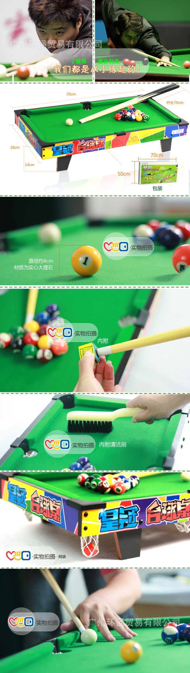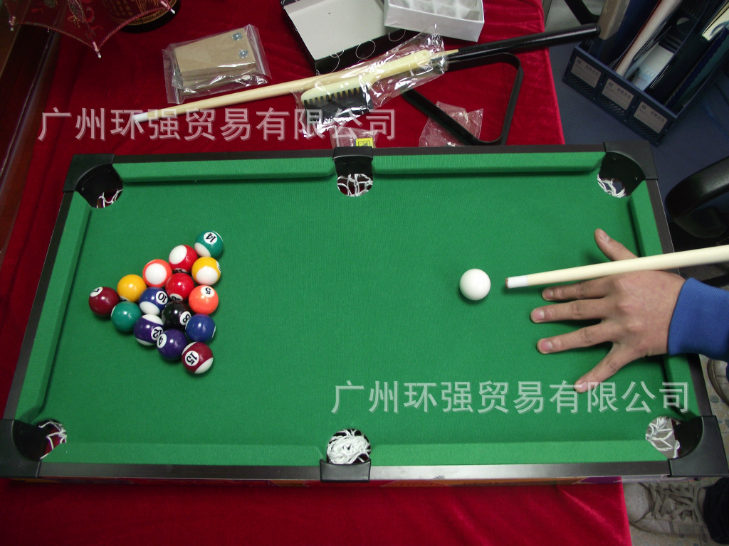 台球桌采用木质(压缩板/密度板)材料制作,做工精量,完全可与真正的台球桌媲美,球与球杆均采用与真正台球完全一样的材料,个头比真正的台球相仿。