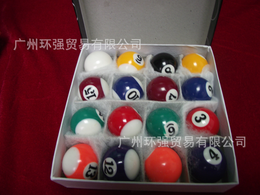 球:共有十六个球,其中1个主球(白色),1-7号为全色球,9-15号为花色球,8号球为黑色。用三角框将15个彩球摆成三角形,8号球摆放在第三排中间,其余全色和花色球要尽量差开摆放。顶点上第一颗球,放置在置球点上,彩球要摆正紧靠,不可有空隙。