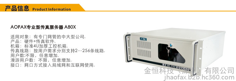 本网页所展示的有关【傲发(AOFAX) 网络传真服务器系统 电子无纸数码传真机 传真服务器 专业型A801(支持1外线)_传真机_金恒科技(深圳)有限公司】的信息/图片/参数等由简塑制品网的会员【金恒科技(深圳)有限公司】提供,由简塑制品网会员【金恒科技(深圳)有限公司】自行对信息/图片/参数等的真实性、准确性和合法性负责,本平台(本网站)仅提供展示服务,请谨慎交易,因交易而产生的法律关系及法律纠纷由您自行协商解决,本平台(本网站)对此不承担任何责任。您在本网页可以浏览【傲发(AOFAX) 网络传真服务器系统 电子无纸数码传真机 传真服务器 专业型A801(支持1外线)_传真机_金恒科技(深圳)有限公司】有关的信息/图片/价格等及提供【傲发(AOFAX) 网络传真服务器系统 电子无纸数码传真机 传真服务器 专业型A801(支持1外线)_传真机_金恒科技(深圳)有限公司】的商家公司简介、联系方式等信息。