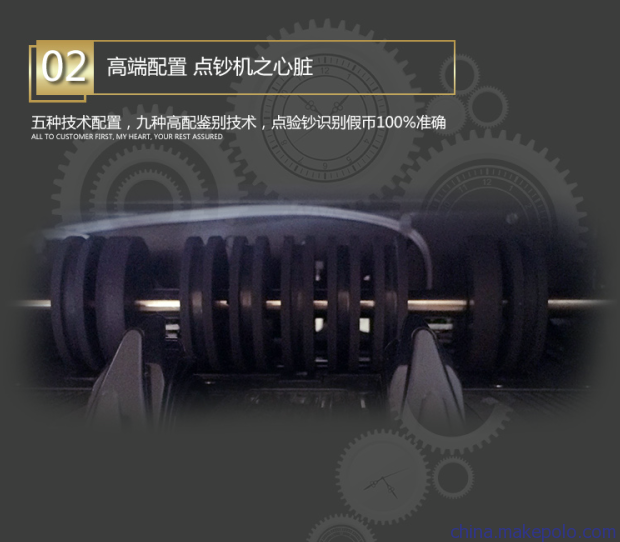在配置上,采用进口器件和高级传感件,大功率的主电机、耐磨的橡胶件;采用磁性、紫外、红外、穿透、纸质分析、安全线等多重技术综合识别假币,鉴伪能力更加完善准确,分析鉴别技术达10余种之多。