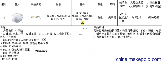 经济型无纺布防护口罩。有效用于建筑、矿山、铸造、电子、制药等工业产生的各种粉尘颗粒物(包括油性颗粒物)防护。另有型号M1200C,大尺寸供选。