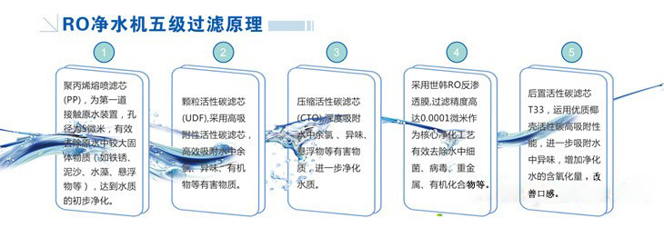 | 第四级过滤 | 反渗透RO膜 | 截留水中的细菌、病毒、有机物、胶体、农药、重金属及大部分盐类 | 12-24个月左右 | 出水量很小,低于30升/每小时 |