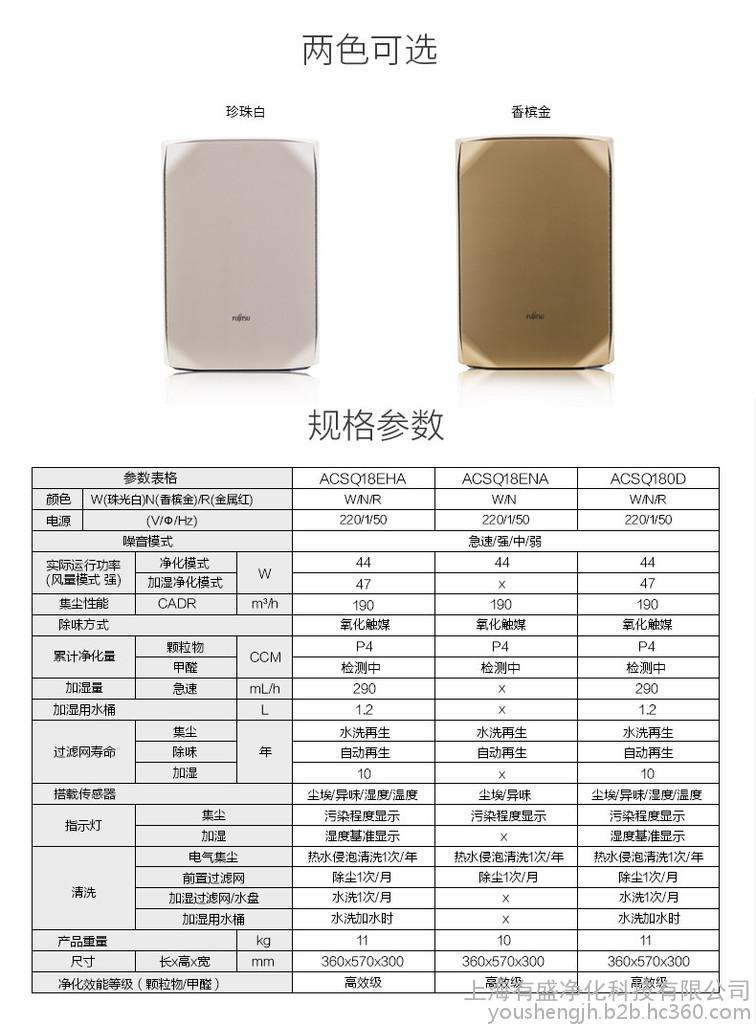 品牌: Fujitsu/富士通                                   保修期: 12个月                                      型号: ACSQ18ENA 噪音: 33-58dB                                            控制方式: 按键式                                   智能类型: 其他 **大噪音: 58dB                                          滤网类型: 无                                          空气净化能效等级: 高效级 货号: ACSQ18ENA                                      颗粒物CADR值: 190立方米/小时               颗粒物CCM值: P4(12000≤M) 颜色分类: 珍珠白 香槟金                             风量: 240立方米/小时                             适用面积: 11㎡ (含)-20㎡ (含) 功能: 定时 除VOC 除花粉 除颗粒物 除甲醛 除烟除尘 杀菌 除雾霾 除菌                         工作原理: 静电技术 臭氧 其他 空气净化产品类别: 空气净化器                    风量: 151-300 立方米/小时                      电源方式: 交流电 售后服务: 全国联保                                    适用对象: 商用、家用                              空气净化器风量: 151-300 立方米/小时