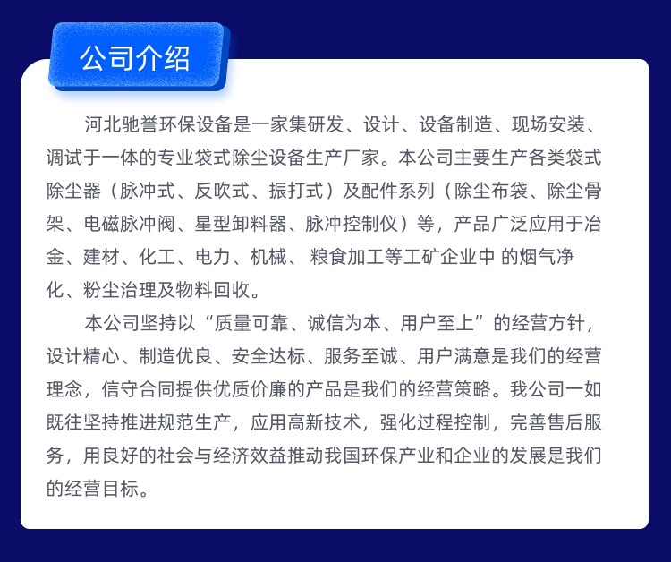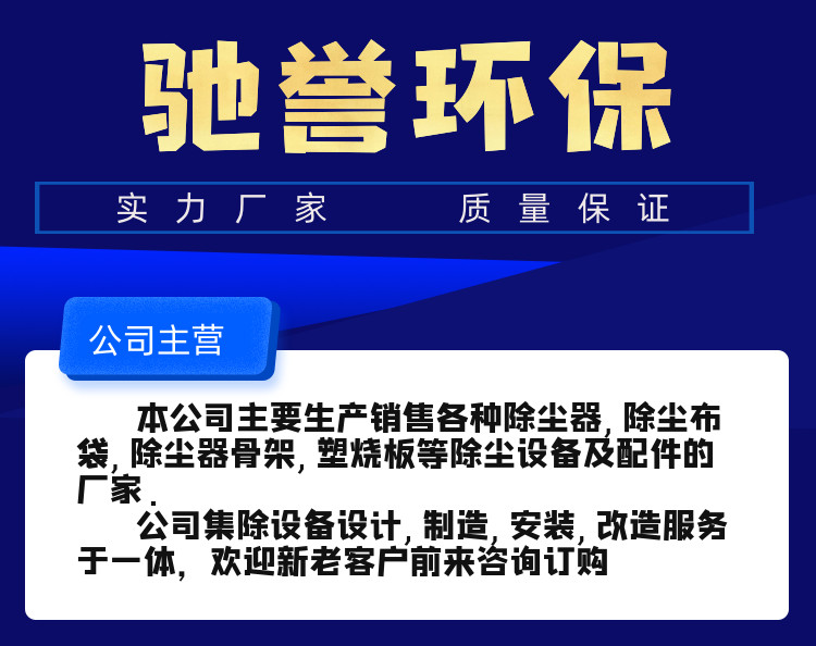 主营:除尘布袋,除尘器,脉冲式除尘器,除尘骨架,电磁脉冲阀,星型卸料器,脉冲控制仪,布袋除尘器,单机除尘器,污水处理设备,废气处理设…