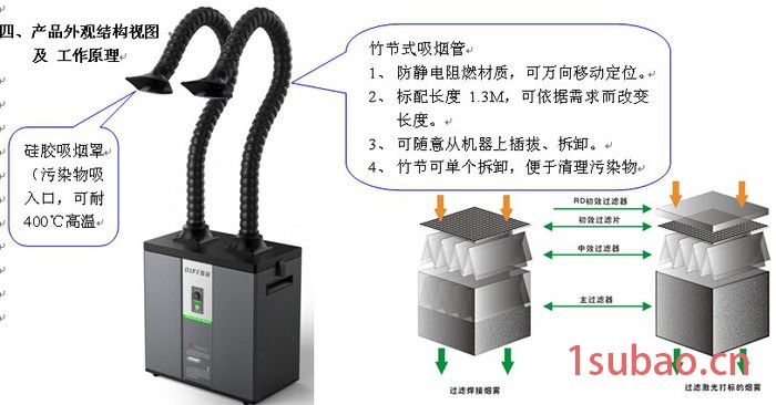 ◆机器配以万向吸烟臂,可随意变向、定位(长度可根据客户要求定制)。端部装以新型集烟罩,造型独特,吸烟效率更高。