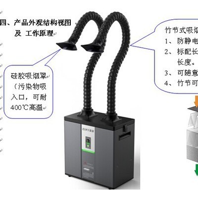针对烙铁焊锡、锡炉浸锡、激光打标、激光医疗、化学实验等场合所产生烟雾、少量粉尘、异味、有毒有害气体进行净化过滤。双进风口设计,可同时对两个工位进行作业。如只需对一个工位进行作业则可关闭另一进风口,操作简单,节能环保。