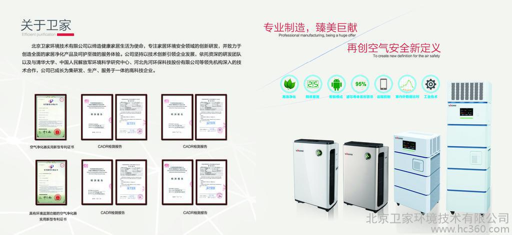 北京卫家环境技术有限公司以缔造健康家居生活为使命,专注家居环境安全领域的创新研发,并致力于创造全面的家居净化产品及呵护至微的服务体验。公司坚持以技术创新引领企业发展,依托**的研发团队以及与清华大学、中国人民解放军环境科学研究中心、河北先河环保科技股份有限公司等**机构深入的技术合作,公司已成长为集研发、生产、服务于一体的高科技企业。