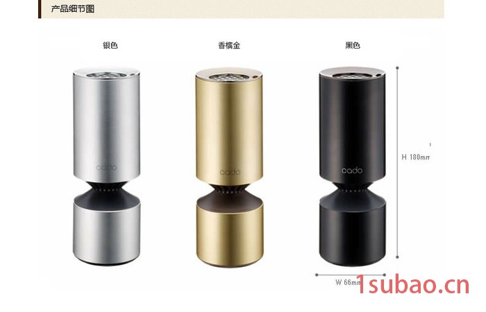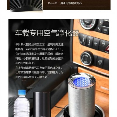 cado MP-C10车载蓝光空气净化器,是一款时尚、科技感、健康环保的车载空气净化器,放置方便,可放于车内水杯位,电源可连接点烟器。也可放于办公桌上,配用电源线。