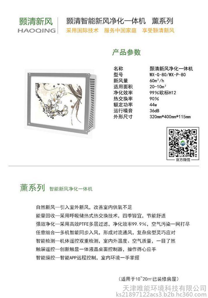 天津唯能环境科技有限公司是专业从事空气热交换、净化及相关产品研发、生产、销售为一体的集成供应商。公司始终服务于食品、医药、电子等对空气净化及结构装修有严格要求的行业。后期公司针对日渐严重的空气污染问题,历时两年对国外技术进行多方调研**终引进了德国、奥地利被动房屋节能通风理念,并与天津大学、天津商学院等相关院系合作,成功研发出“颢清”新风净化系统。目前公司针对该系列产品拥有多项**认证**,并已取得欧盟CE认证。