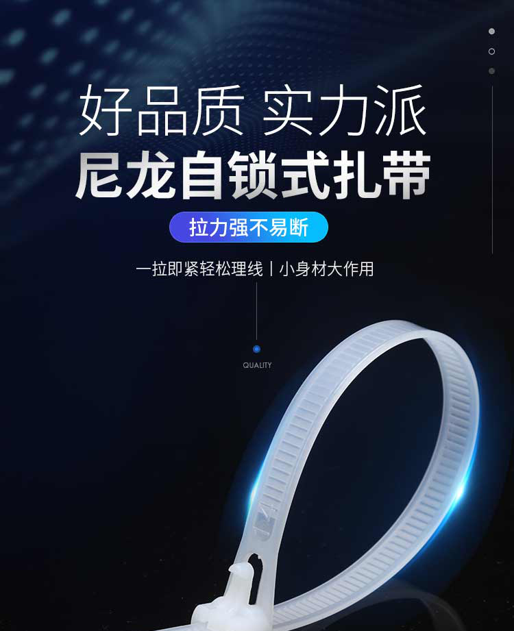 自锁式尼龙扎带广泛用于各行业连接线的捆扎,品质可靠 安全耐用 尼龙新料 全新料生产,黑白两色可选 ,规格:5x500mm 材质:PA66尼龙新料防火等级94V-2,产品特点:韧性好 自锁紧固 耐酸耐腐蚀 不易老化 使用环境:-20°C至 80°C,保证全新料生产,脆断色差滑齿包退换。免费寄样,欢迎随时上门考察。源头工厂支持各种规格定做!常年库存充足,主打外贸出口。另支持各种特殊颜色定做,出厂有拉力耐高低温和水分测试。包退换!