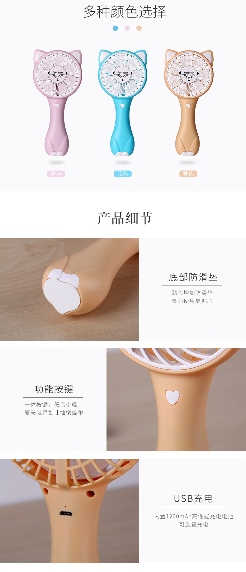 产品名称 **风扇 材 质 ABST+PC+电子元件 外包装 彩盒 装箱量 80 pcs 产品尺寸 191*90*42mm 产品包装 8.4*8.4*12.6cm 外箱尺寸 44.3*43*42CM 外箱体积 0.08 CBM 单个净重/毛重 125 G 整箱毛重 10/16.25KG 款式/颜色 蓝色、粉色、黄色、 电池容量:1200MA 输出功率:5W 电池电压:3.7V/1200mA 输入电压/电流:DC5V/1000mA 产品配件:数据线1条,说明书1份 工作电流:低档320mA/中档620mA/**850mA 工作功率:低档1.3W/中档2.6W/**3.5W 本机充满电大约需3小时左右;抵挡可使用3.5小时左右,**可使用1.5小时左右。 充电时红灯亮,充满灯灭。