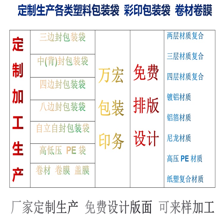 主营:定做包装袋,食品包装袋,真空包装袋,铝箔包装袋,高温蒸煮包装袋,大米包装袋,调味品包装袋,日用品包装袋,宠物食品包装袋,兽药包…