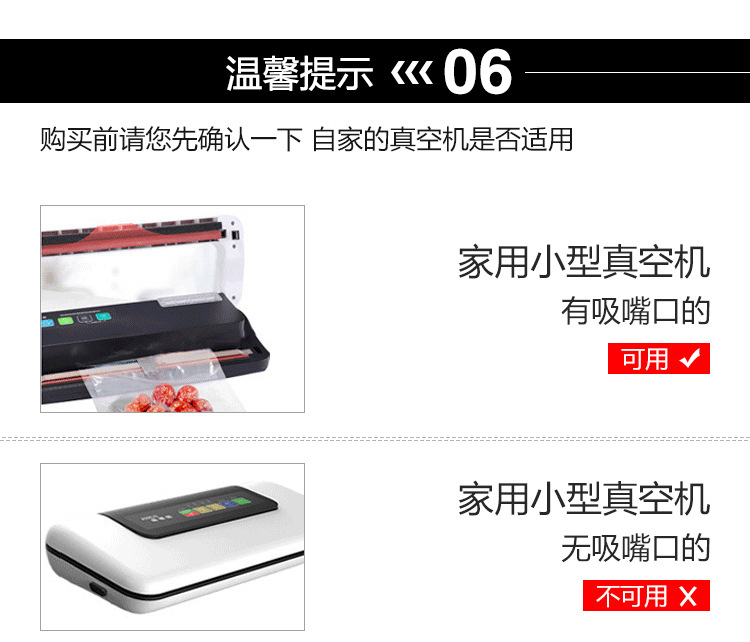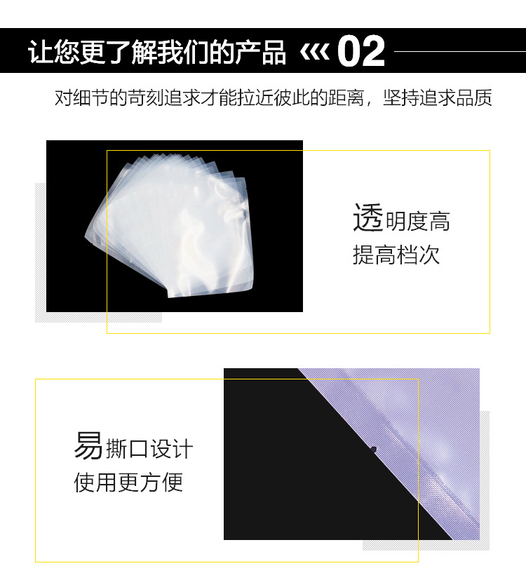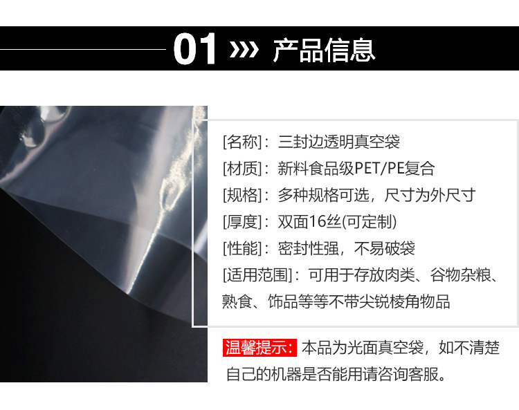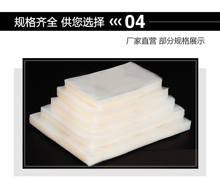 1. 特级真空包装袋,选用材料经过QS认证符合食品标准,做工精细,封口边缘平整,厚度一致,透明度高,每批真空袋出厂经过车间技术部门的严格检验后出厂。