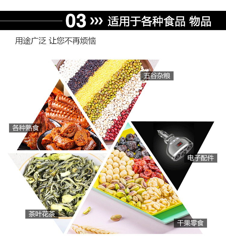 6.用于工业机械零件、电子工业原料及精密机械等;用于茶叶、咖啡、可可、香精、香料、食品添加剂、油脂类、化妆品的保香、保色、面膜类等;