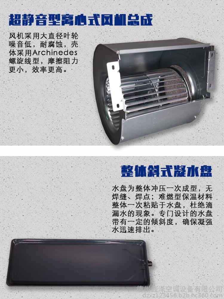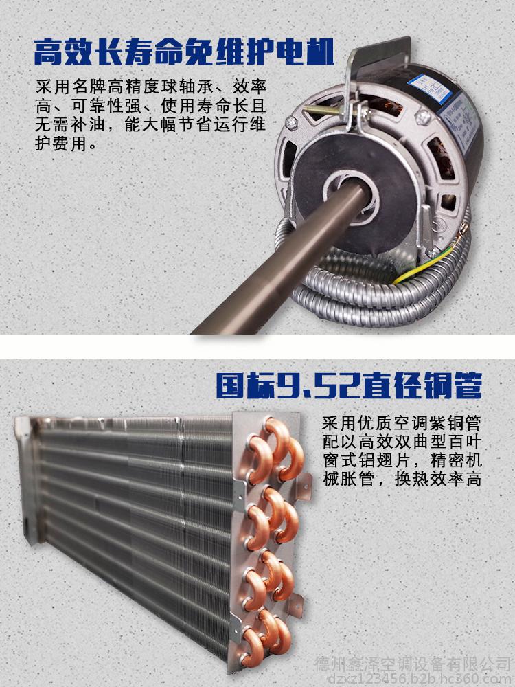 可巧妙安装于窗台下或凹墙内,不会占用您宝贵得空间。出风方向有前出风(0°),上出风(90°)和斜出风(45°)三种,可供选择。安装检修保养极为方便,噪音低。 ??高效节能风机马达轴心经调质与硬铬特殊防锈处理,运转平稳、功率小、效率高。钢制叶轮经动平衡检测,效率高、噪音低。风机盘管主要由风机,换热盘管和机壳组成,按风机盘管机外静压可分为标准型和高静压型、按换热盘管排数可分为两排和三排,换热盘管一般是采用铜管串铝翅片,铜管外径为10~16mm,翅片厚度约0.15~0.2mm,间距2.0~3.0mm,风机一般采用双进风前弯形叶片离心风机,电机采用电容式4极单相电机、三档转速、机壳和凝水盘隔热。 风机盘管空调系统的工作原理**是借助风机盘管机组不断地循环室内空气,使之通过盘管而被冷却或加热,以保持房间要求的温度和一定的相对湿度。盘管使用的冷水或热水,由集中冷源和热源供应。与此同时,由新风空调机房集中处理后的新风,通过专门的新风管道分别送人各空调房间,以满足空调房间的卫生要求。 风机盘管空调系统与集中式系统相比,没有大风道,只有水管和较小的新风管,具有布置和安装方便、占用建筑空间小、单独调节好等优点,广泛用于温、湿度精度要求不高、房间数多、房间较小、需要单独控制的舒适性空调中。 立式明装风机盘管的维护 1、机组定期检查电机运转是否正常,有无异物卡进风壳内。 2、如发现出风口无风,应关机检查,电机是否烧坏、或风管是否堵塞。 3、如有风而不制冷或制热,应检查表冷器是否堵塞,或者阀门是否开启。 4、发现漏水,应及时检查是保温不好,还是凝结水排放不畅,或是表冷器铜管损坏,并及时处理。 5、回风口过滤网应定期进行清洗。