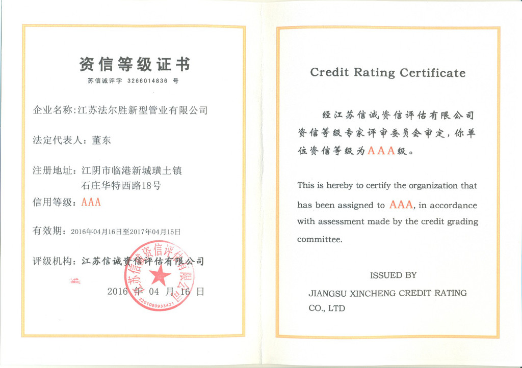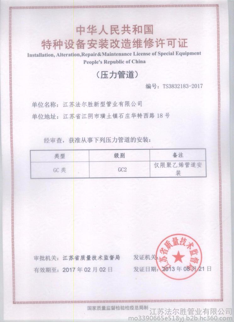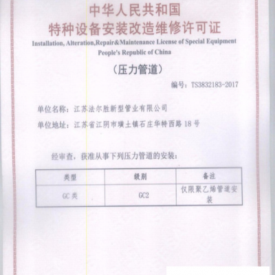 公司作为江苏省高新技术企业,十分重视企业的技术创新和可持续发展,先后开发的6只新产品均被评为江苏省高新技术产品。钢丝网骨架聚乙烯复合管先后被无锡市、江苏省评选为**产品,燃气用孔网钢骨架塑料复合管2002年7月被**科技部、**税务总局、**对外经济贸易部、**质检总局、**环保总局五部委联合评审为**级重点新产品,列入**火炬计划重点发展项目。聚乙烯(PE)缠绕结构壁管荣获2003年建设部科技成果重点推广项目、2004年**科技成果重点推广计划。2006年12月由建设部组织对中国管道行业自主创新进行评审,江苏法尔胜新型管业有限公司获得“中国建设科技自主创新**优势企业”列第二位称号,公司重视产品的标准化工作,参与编制了孔网钢骨架塑料复合管的**工程技术规程(CJJIOI、CESC181)、建设部标准孔网钢骨架塑料复合管(CJ/181、,CJ/182),化工部标准(HG/T3706、HG/T3707、HG/T4586)和聚乙烯(PE)缠绕结构壁管的江苏省推荐性技术规程等。公司以“诚信为本、品质为先”为经营宗旨,始终坚持“今日的质量、明日的市场;用户的需求、我们的追求“的质量方针,十分重视企业的全面发展,先后通过了**质检总局的压力管道安全注册认证,中国船级社的ISO9001:2000质量体系认证、ISO14001:2004环境体系认证及英国劳氏公司质量体系认证,从产品设计到产品制造,从产品销售到售后安装都有完善的质量保证体系。