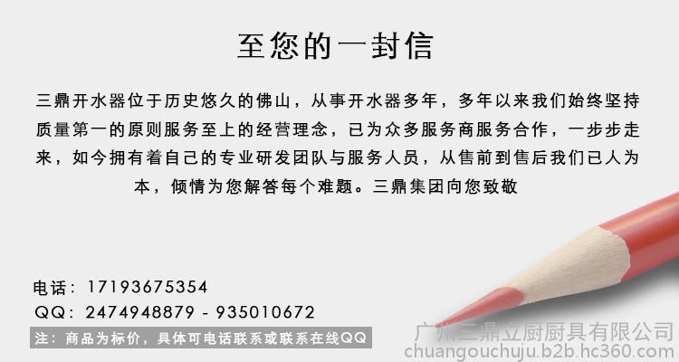 本网页所展示的有关【三鼎C-60H220V 开水器 开水器全自动厂价批发_开水器_广州三鼎立厨厨具有限公司】的信息/图片/参数等由简塑制品网的会员【广州三鼎立厨厨具有限公司】提供,由简塑制品网会员【广州三鼎立厨厨具有限公司】自行对信息/图片/参数等的真实性、准确性和合法性负责,本平台(本网站)仅提供展示服务,请谨慎交易,因交易而产生的法律关系及法律纠纷由您自行协商解决,本平台(本网站)对此不承担任何责任。您在本网页可以浏览【三鼎C-60H220V 开水器 开水器全自动厂价批发_开水器_广州三鼎立厨厨具有限公司】有关的信息/图片/价格等及提供【三鼎C-60H220V 开水器 开水器全自动厂价批发_开水器_广州三鼎立厨厨具有限公司】的商家公司简介、联系方式等信息。