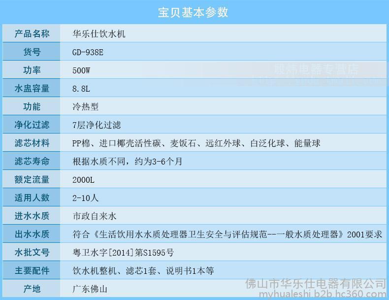 华乐仕饮水机 GD-938E、GD-938E(粉红色、咖啡色、绿色),冰热型台式饮水机,带多层净化过滤器,适用于家庭、单位、工厂、集体宿舍、学校等。