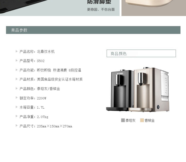 本网页所展示的有关【Buydeem/北鼎 S502小型台式饮水机家用迷你型即热式_饮水机_深圳市北鼎科技有限公司】的信息/图片/参数等由简塑制品网的会员【深圳市北鼎科技有限公司】提供,由简塑制品网会员【深圳市北鼎科技有限公司】自行对信息/图片/参数等的真实性、准确性和合法性负责,本平台(本网站)仅提供展示服务,请谨慎交易,因交易而产生的法律关系及法律纠纷由您自行协商解决,本平台(本网站)对此不承担任何责任。您在本网页可以浏览【Buydeem/北鼎 S502小型台式饮水机家用迷你型即热式_饮水机_深圳市北鼎科技有限公司】有关的信息/图片/价格等及提供【Buydeem/北鼎 S502小型台式饮水机家用迷你型即热式_饮水机_深圳市北鼎科技有限公司】的商家公司简介、联系方式等信息。