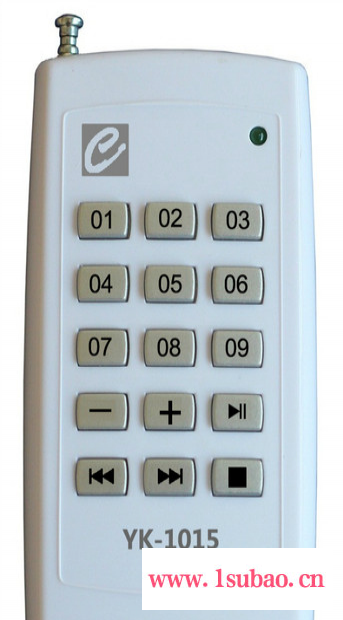 YK-1015 15键无线遥控器是在原8键遥控器的基础上对广播机遥控功能进行了重新定义,增加了播放暂停键、上曲下曲键、音量调节键,遥控点播的曲目数量由5个增加到9个,并且每个点播曲目都可以自由设置功放和分区。