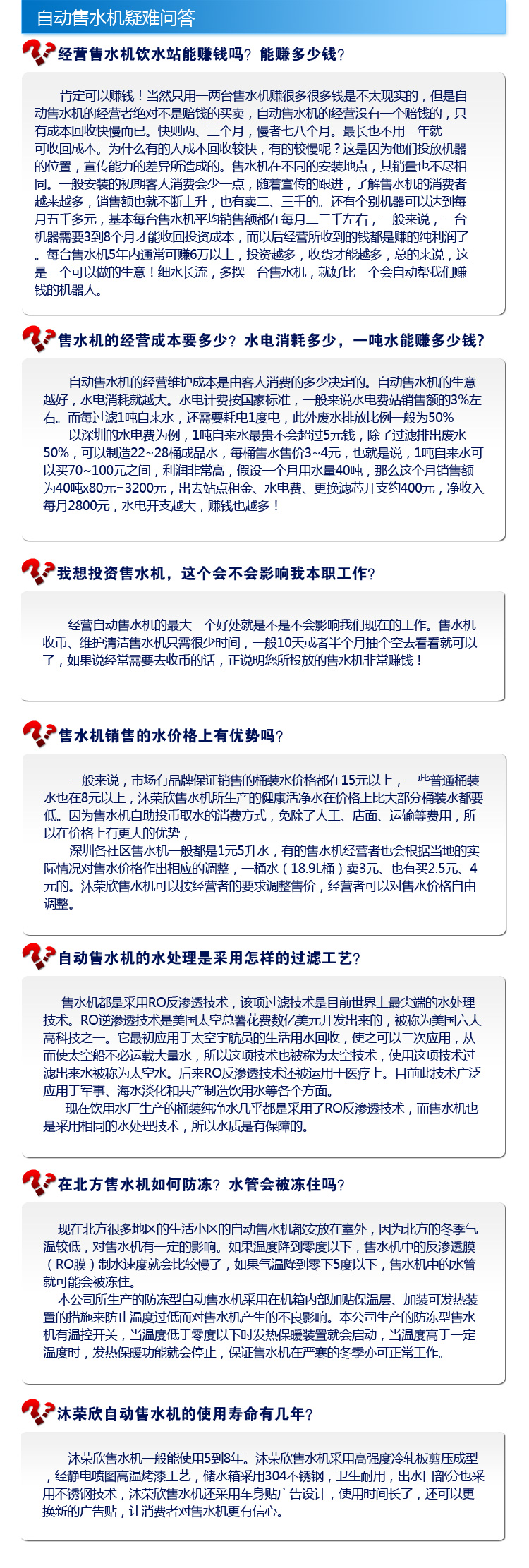 沐荣欣自动售水机的诞生,是在市场低迷的情况下,所开创一条新的经营模式。为解决资金短缺、无好项目、没好场地的有志之士带来福音,更是为有识之士带来成功的起步平台。