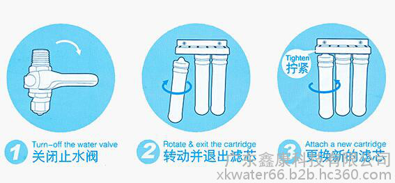 新康多功能还原水机滤芯更换时只需3步即可,第一:关闭水阀、第二:旋转并退出旧滤芯,第三:更换新滤芯并拧紧。